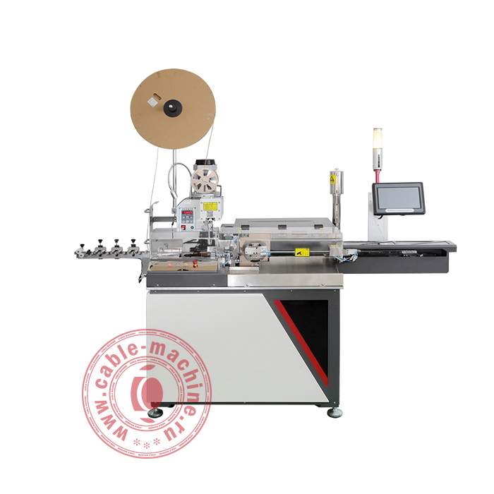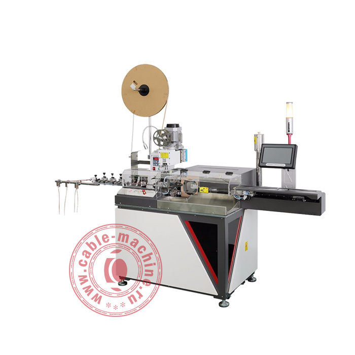 Станок для лужения, опрессовки наконечников на провода KS-W1144 – это полностью автоматическая многофункциональная электропневматическая машина непрерывного действия, предназначенная для того, чтобы выполнить следующие операции: втянуть проволоку в операционную зону через систему её выравнивания, при этом втягивается одновременно четыре проводника; отрезать на необходимую длину и одновременно зачистить от изоляции; выполнить обжим каждого проводника клеммой с одной стороны; скрутить по два проводника между собой; выполнить лужение проводников с противоположной от клемм стороны. Изделие оснащается ПЛК, серводвигателями, операционной цветной ЖК панелью, сигнальной лампой «светофор».