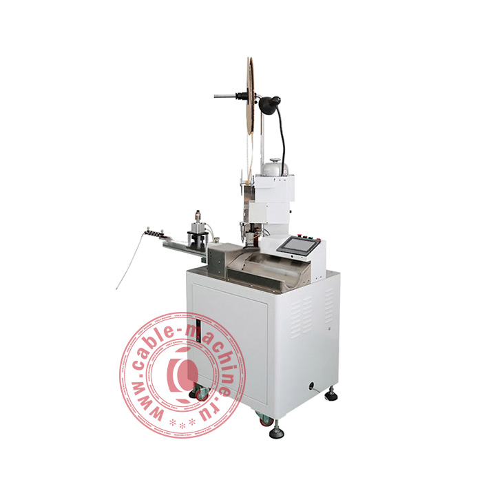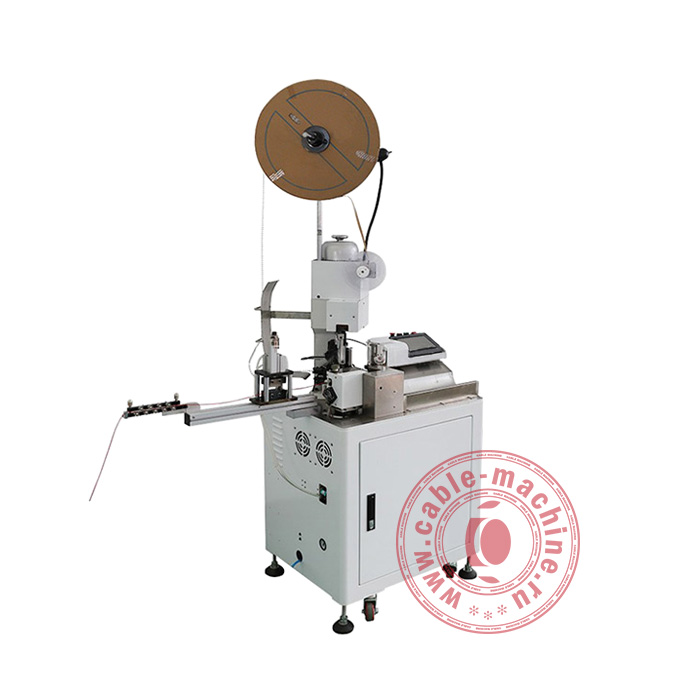 Станок для опрессовки наконечников провода KS-R1CD – это автоматическая машина, с помощью которой нарезаются, зачищаются и с одной стороны обжимаются клеммами проводники. Точность и качество гарантируются цифровой системой управления, в состав которой входит программируемый логический контроллер, операционный сенсорный экран, частотный преобразователь скоростей, оптические датчики и др. Имея интуитивно понятный интерфейс управления, оператору достаточно только ввести такие параметры, как скорость подачи провода, длину отреза, глубину зачистки и силу опрессовки.