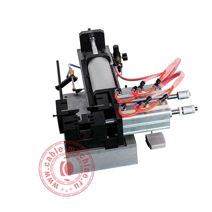 Пневматический станок для зачистки кабеля W404, а также образцы W411, W410, W407, W406, W405, W412, W402 и W401 – это одна серия изделий для разных стандартов кабельной продукции. Принцип действия всех устройств заключается в том, что оператор вводит проводник в зону резки до упора и нажимает ножную педаль пуска давления. После чего первый пневматический цилиндр фиксирует тисками заготовку, второй тянет платформу на себя, а третий в это время запускает в действие лезвия.