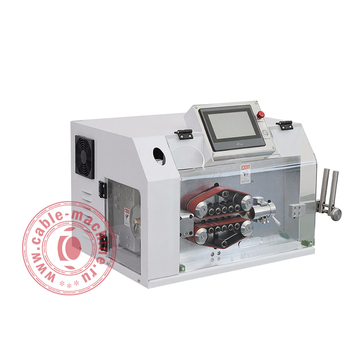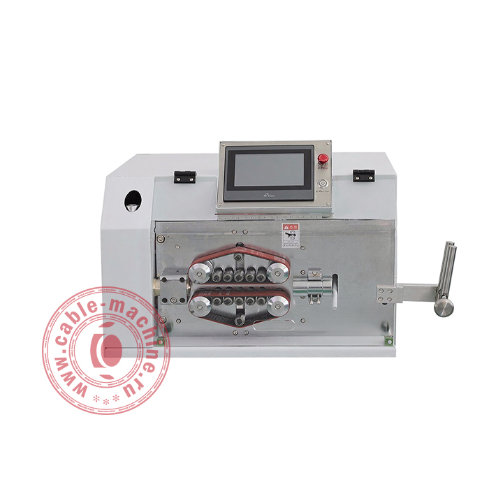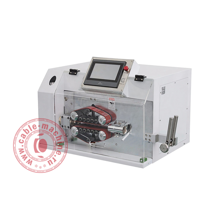 Станок для резки гофрированных проводов KS-C511 – это настольный аппарат, действие которого направлено на быстрое и точное отделение фрагмента необходимой длины от подаваемого материала. Аккуратность во многом достигается за счет того, что резка выполняется вращающимся вокруг объекта лезвием. Втягивание трубки – с помощью двух ремней, натянутых на ролики, между ремнями регулируемый зазор. Через цветной сенсорный экран могут быть быстро введены такие данные программы, как давление подачи, скорость подачи, направление вращения лезвия, скорость вращения и др. Предусмотрена кнопка аварийного выключения питания.
