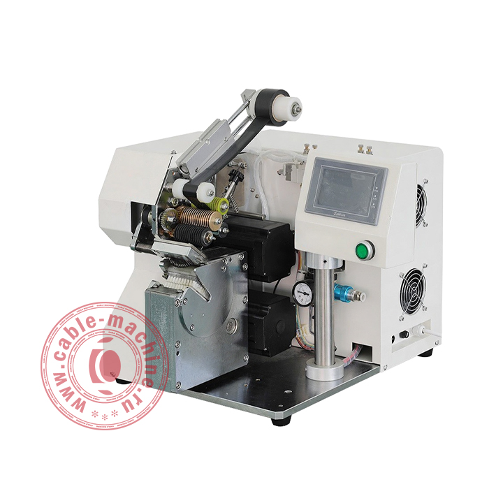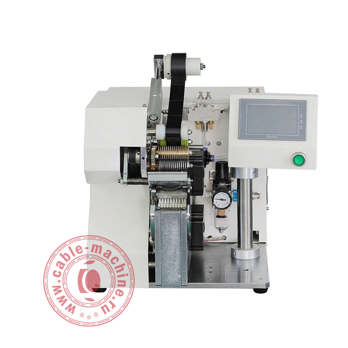 Станок для бандажирования проводов KS-A2011 стоит шаг впереди от любого ручного инструмента, которые так широко распространены. Головка ленты, которая выглядит как опорный подшипник с очень широким отверстием, устанавливается поверх рабочего стола. Головка ленты приводится в движение двигателем постоянного тока с регулируемой скоростью. Ножная педаль под столом активирует головку ленты и регулирует ее скорость. Чтобы заклеить жгут, оператор открывает защитную крышку, вставляет ремень в головку ленты и включает приводные ролики. Затем оператор закрывает крышку и наступает на ножную педаль, чтобы начать операцию. Ролики зажимают провода и протягивают их через головку ленты. Кодировщик синхронизирует ролики и головку ленты друг с другом, обеспечивая постоянное перекрытие ленты на любой скорости. Величина перекрытия устанавливается с помощью цифрового регулятора.
