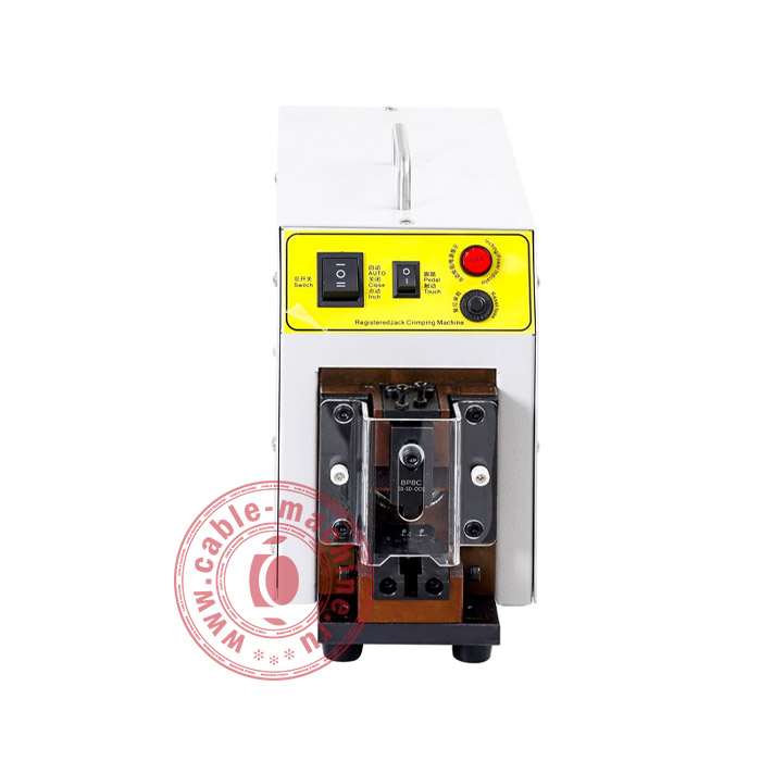 Станок для опрессовки сетевых проводов наконечниками RJ11, RJ45 KS-468-2 выполнен в виде металлического короба на резиновых ножках с ручкой для переноски и с выдвинутым наружу аппликатором. Это электромеханическое устройство (электрические части охлаждаются через вентиляционные прорези в корпусе), которое может работать, как в автоматическом режиме, так и для одиночного обжима. На пульте для этого есть переключатель; для единичной операции используется ножная педаль замыкания контактов. Приемное окно закрыто колпаком из оргстекла, чтобы предупредить попадание пальцев оператора под действие аппликатора.