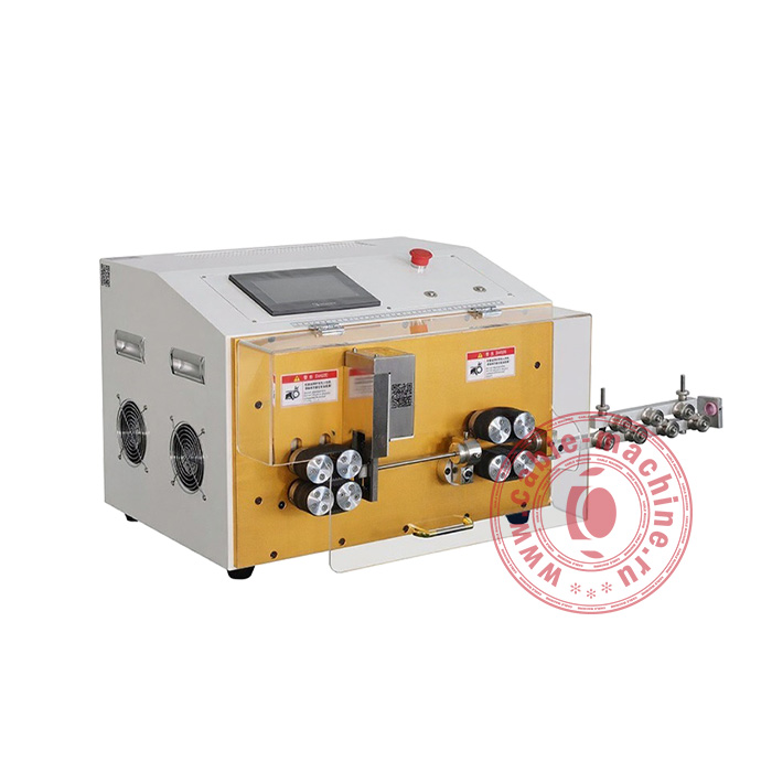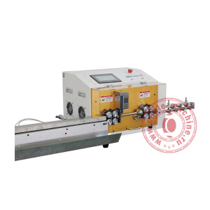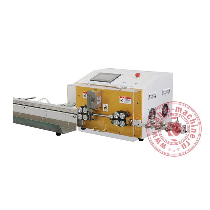 Автоматический станок для резки и зачистки проводов KS-W001 – это настольное оборудование, которое разработано, чтобы быстро и точно удалять наружный слой изоляции с многожильных проводников. При этом общая изоляция удаляется не на хвосте отрезанного фрагмента, а на срединных участках, то есть, изолированные участки чередуются с неизолированными. Выходная втягивающая пара ремней автоматически отстраняется, когда начинает работать ножевой механизм, включающий два вертикальных лезвия с клиновидным внутренним вырезом. Управление: ПЛК, сенсорный экран и сервомоторы. Есть аварийная кнопка.