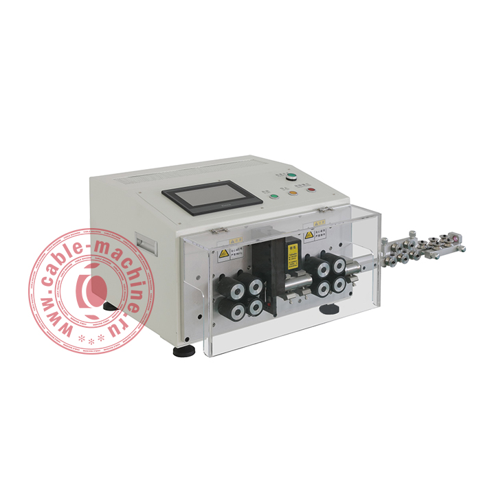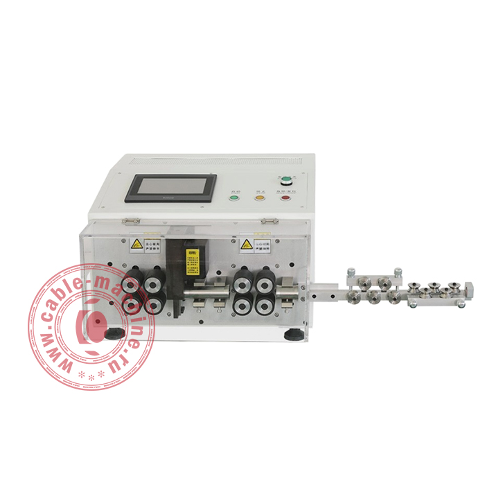 Автоматический станок для резки и зачистки проводов KS-W613 втягивает проводник в зону резки четырьмя парами прочных колес с нескользящим покрытием. На входе и между парами колес установлены трубчатые направляющие для точного позиционирования. Ножевой механизм оснащается шестеренчатым приводом. Всё это в совокупности позволяет обрабатывать проводники сечением до 70 мм2, и использовать изделие для работы со жгутами. Машина управляется через интуитивно понятный интерфейс HMI экрана. Есть программа для снятия трех слоев изоляции или программа для того, чтобы снимать изоляцию в трех местах. Память может хранить до 69 готовых программ для их повторного использования. Давление валов в парах можно регулировать тоже через экран. У выходной пары валов есть функция автоматического подъема, чтобы не помешать зачистке.