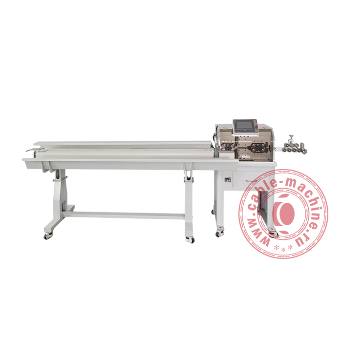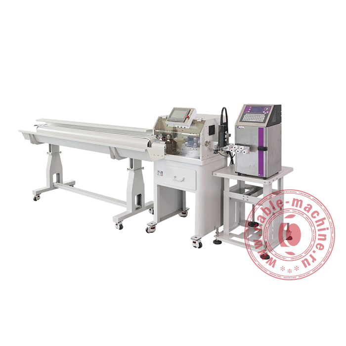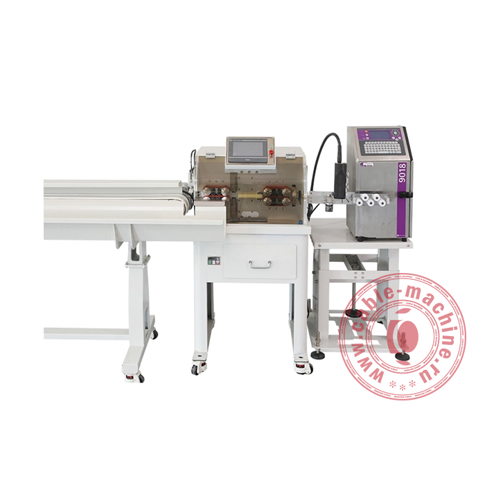 Автоматический станок для зачистки проводов KS-W1020P – это непрерывно действующая программируемая мини линия, в состав которой проектировщики включили: струйный принтер на стеллаже; непосредственно резак с сервоприводами и конвейер с укладкой готовых проводников.