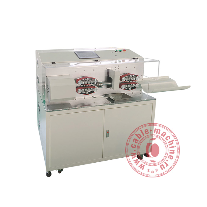 Главные рабочие органы станка EW-3115 – ножевой роторный блок и система полного привода роликов. Машина рассчитана на работу с кабелями и проводами сечением до 120 мм² и максимальным диаметром до 16 мм. Станок удаляет однослойные оплетки из ПВХ, резины, стекловолокна, а также многослойные - на ПВС и ШВВП. Остатки изоляции из рабочей зоны убираются специальным механизмом.