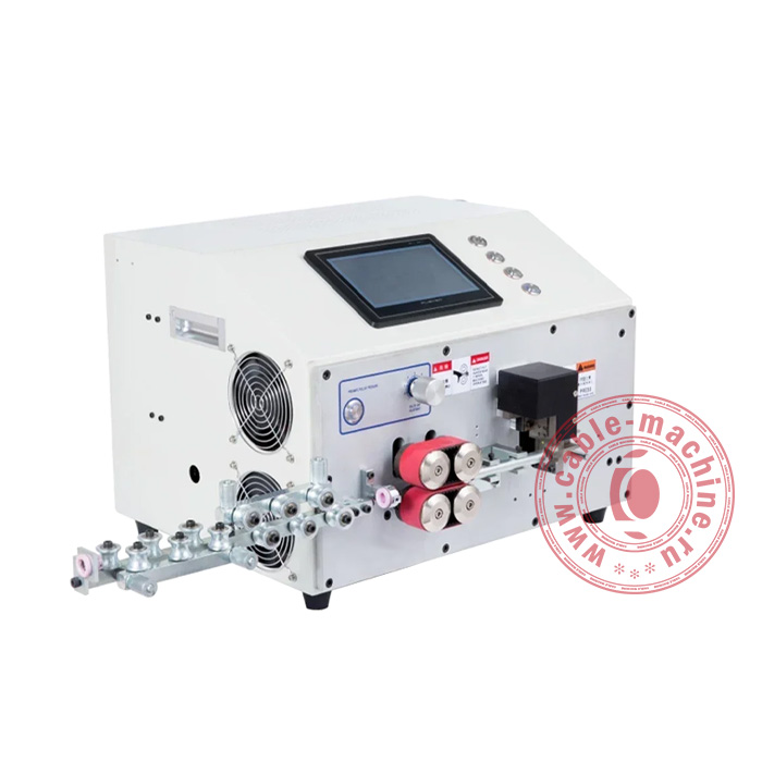 Станок для резки и зачистки провода DY-1220C выполнен в виде настольного металлического короба, внутри которого действует два вентилятора, эффективно охлаждающих аппаратуру и приводы. При втягивании провод выравнивается. Само втягивание выполняется с помощью двух пар валиков с натянутыми ремнями (это точная и плавная подача); зазор между ними регулируется. Перед лезвием кабель позиционируется трубчатой направляющей. Автомат управляется через сенсорный экран – касаниями именно в экране (аналогично принципу бытового планшета). Все настройки выполняются в интуитивно понятном интерфейсе.