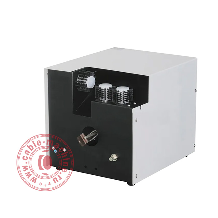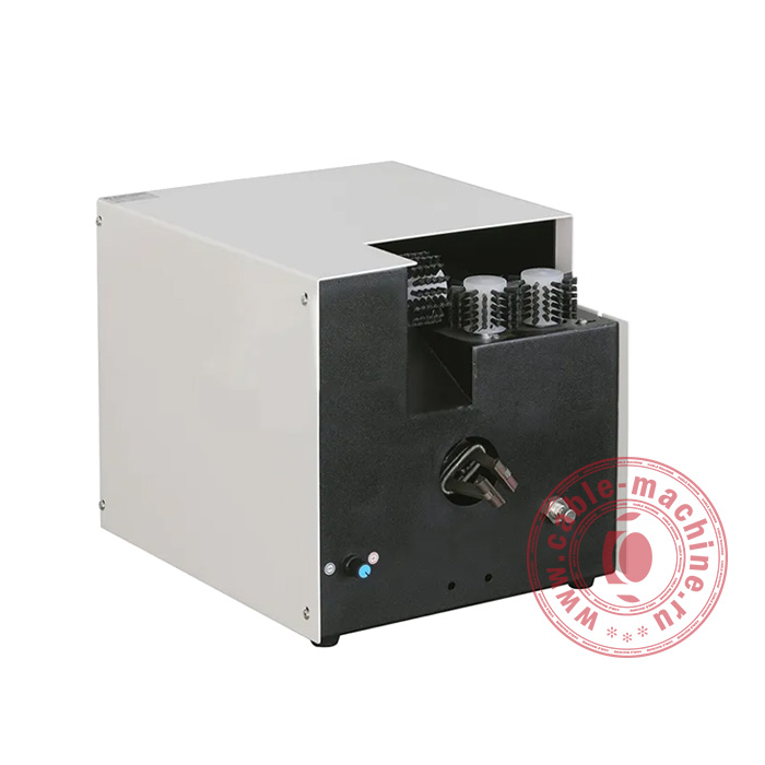 Станок для скручивания провода KS-W02 – это настольная электромеханическая машина, удобная для работ с проводами, у которых внутренняя часть состоит из нескольких жил и покрыта сверху экранирующей оплеткой. Для снятия (расслоения и отделения от сердцевины) оплетки установлено три щетки – одиночная и две в рабочей паре, которые используются в зависимости от ситуации. Для скручивания используется инструмент в виде микро тисков на вращающемся основании. Скорость вращения щеток регулируется, чтобы не повредить оплетку. Общая конструкция имеет вид короба на резиновых ножках.